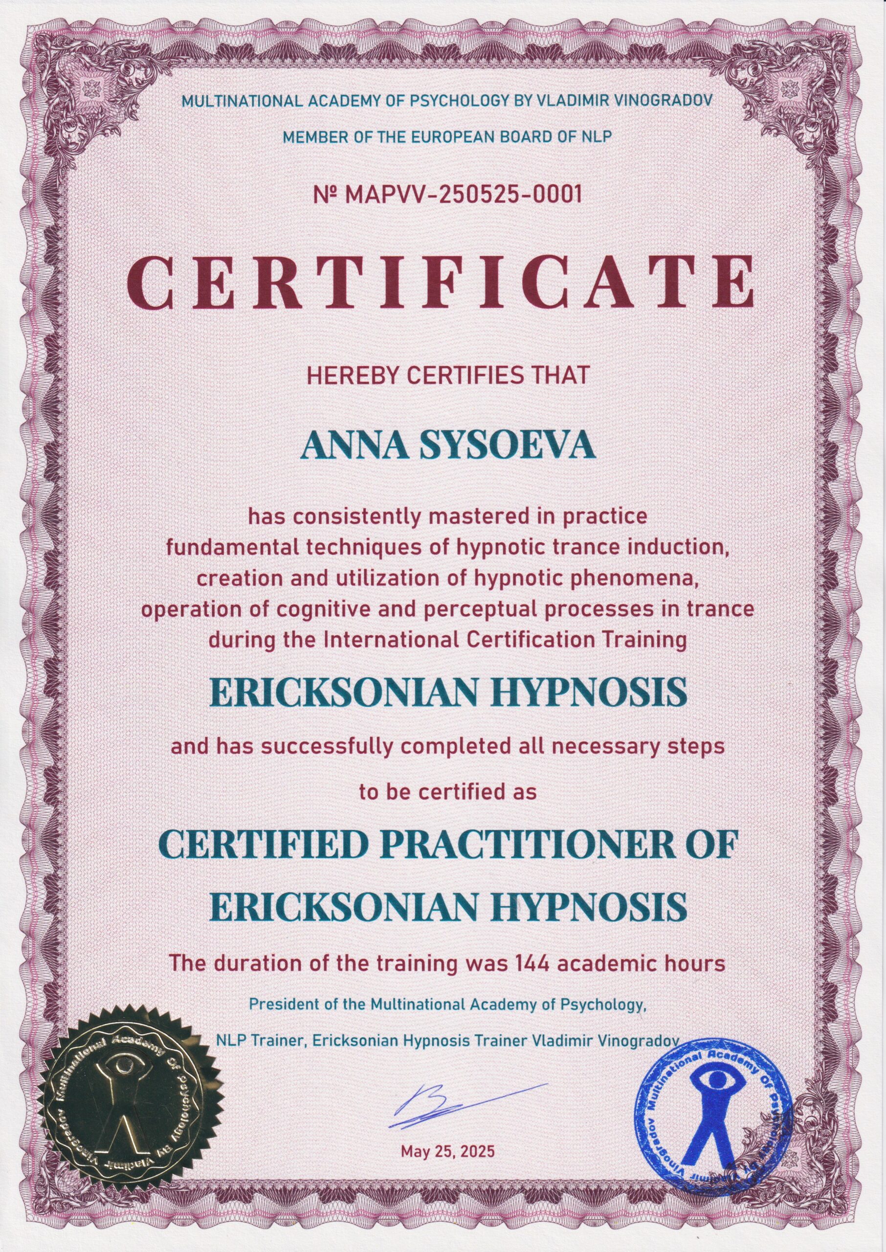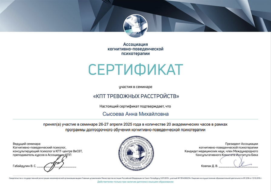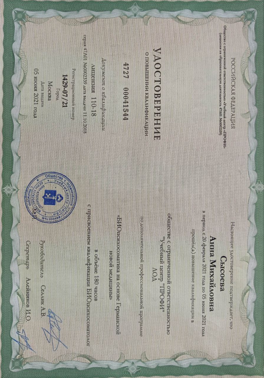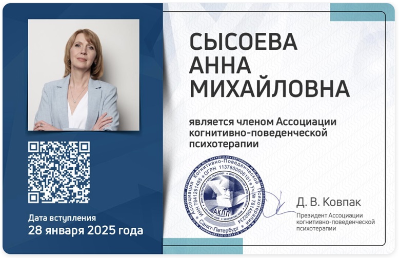 | Направления психологии | КБТ/КПТ, псидваноль (PSY 2.0), регрессия, эмоционально-образная терапия (ЭОТ) |