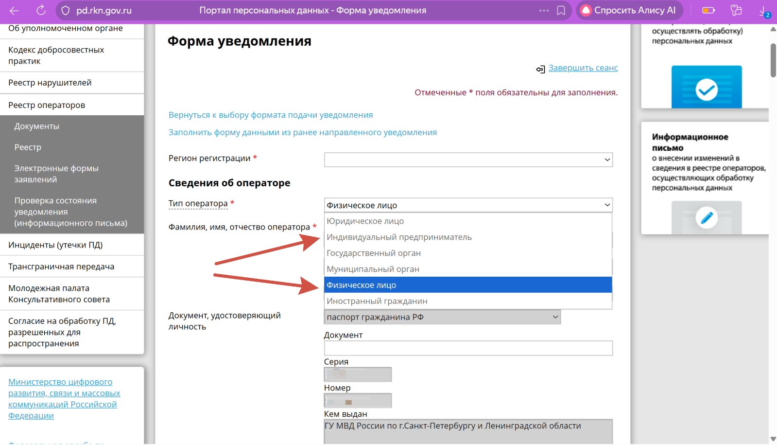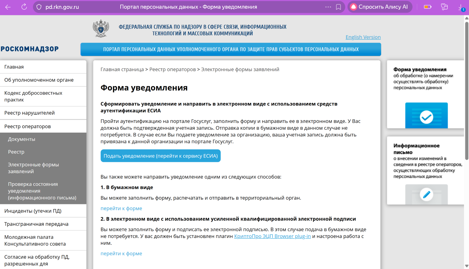 Шаг 2: Заполните уведомление об обработке ПДн через портал Роскомнадзора.