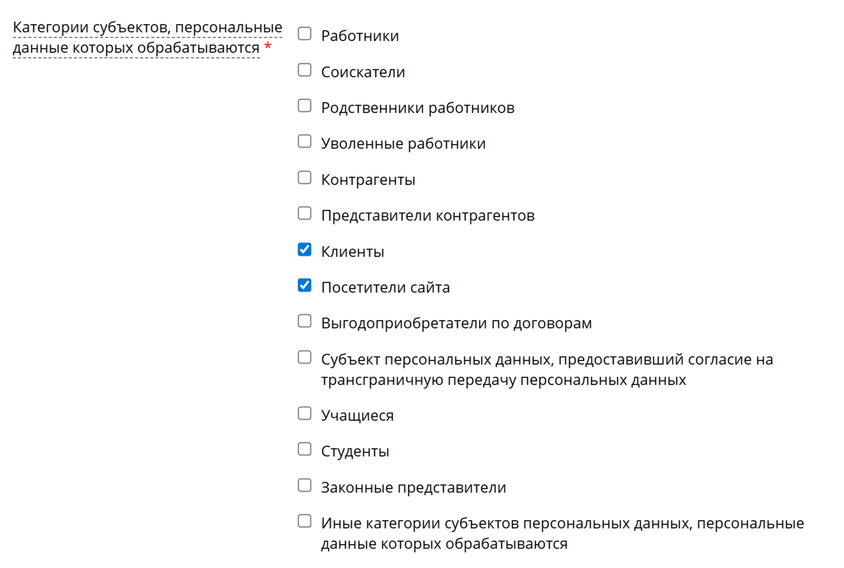 Следующим шагом в поле Категории субъектов, персональные данные которых обрабатываются указываете Клиенты и Посетители сайта