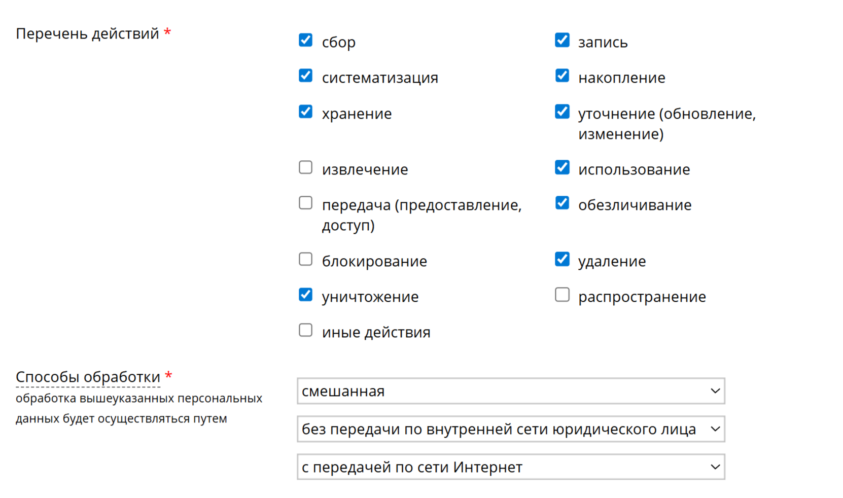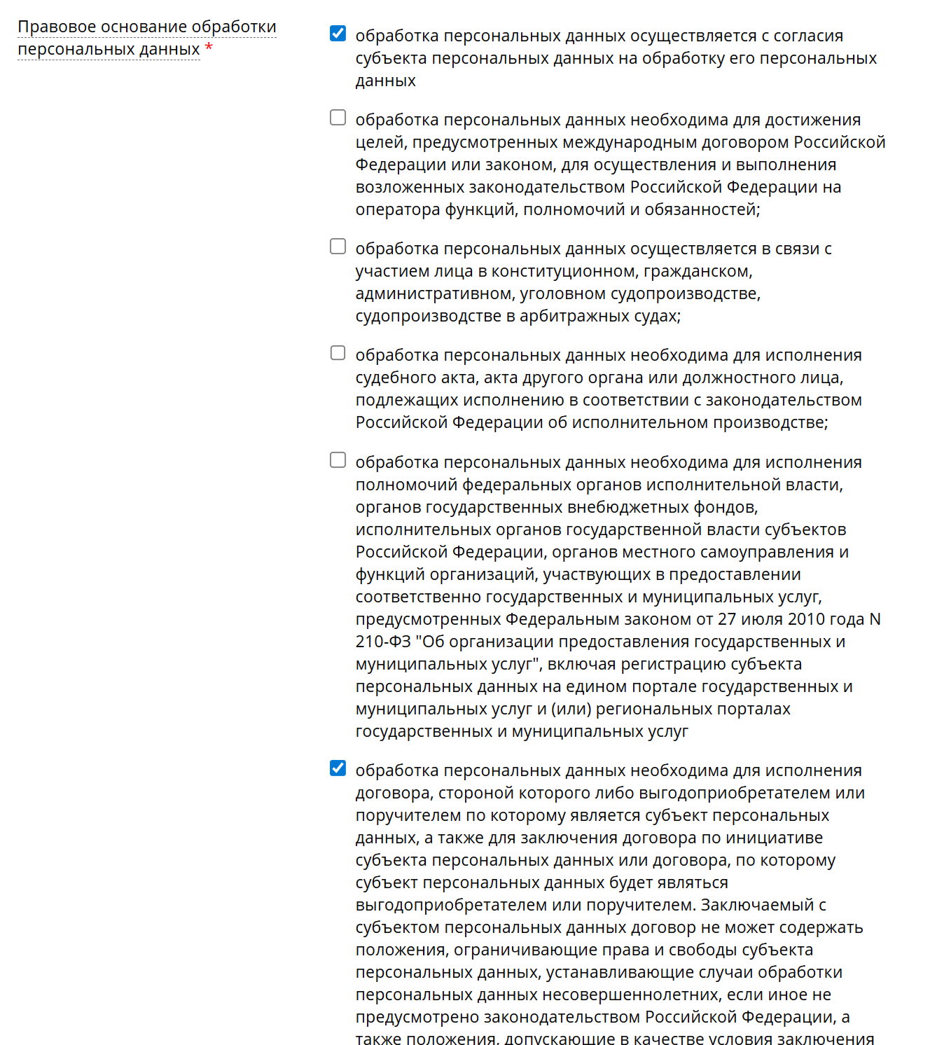 А в поле Правовое основание обработки персональных данных ставите две галочки:
