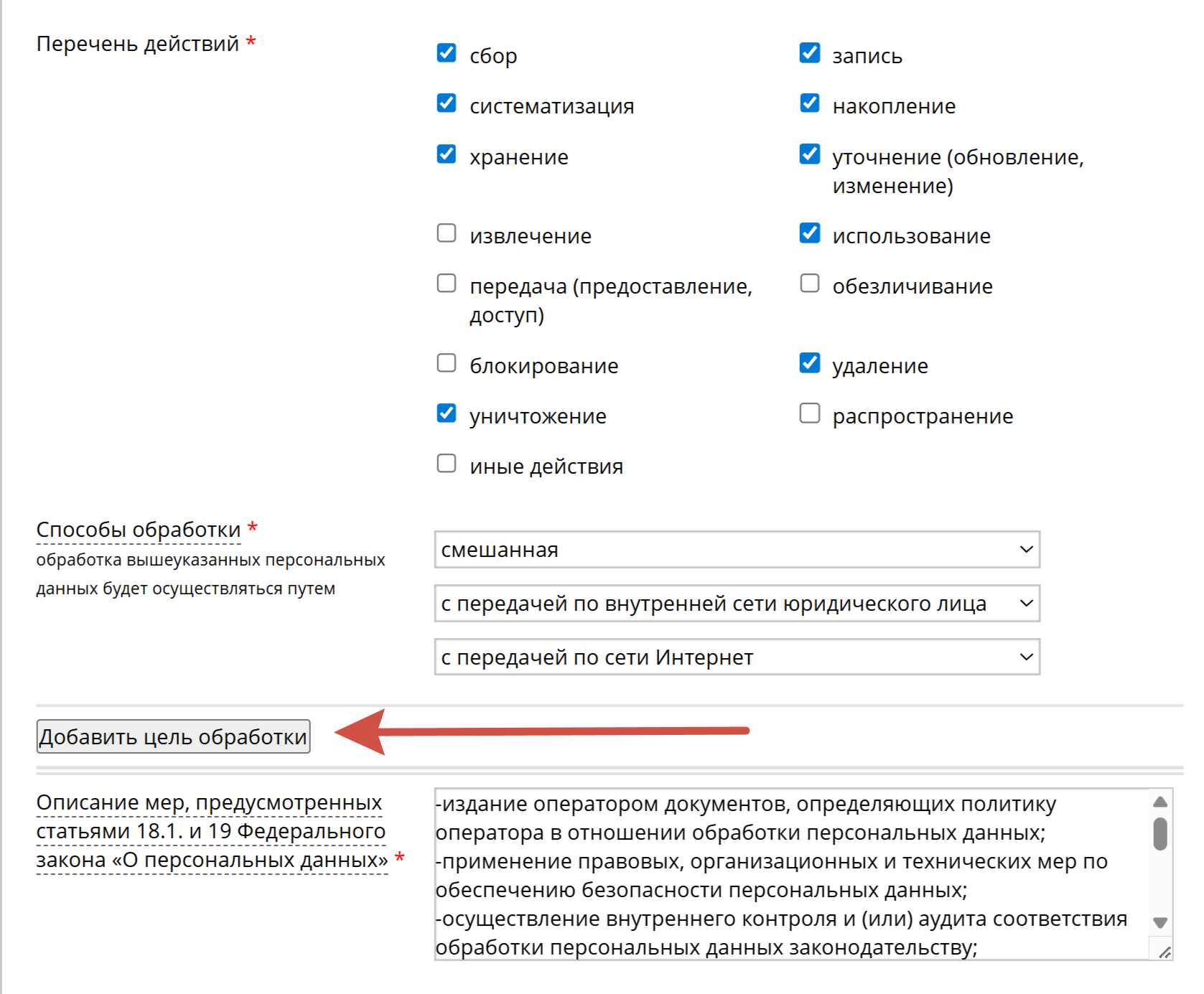 ВАЖНО. Если вы также планируете вести рассылки и использовать данные клиентов для продвижение своих товаров и услуг – вам надо добавить еще одну цель «Продвижение товаров, работа, услуг на рынке». Для этого нажимаете кнопку, показанную на скриншоте ниже, добавляете новая цель. Выбираете её из списка, и заполняете все те же поля, но уже для второй цели.