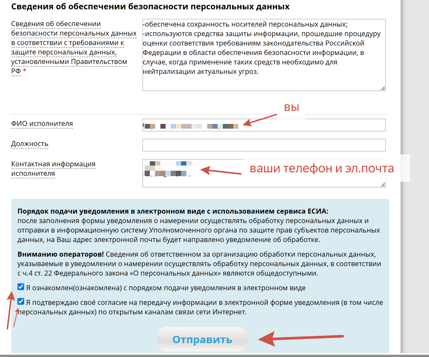 В заключении можно вписать следующий текст в пункт Сведения об обеспечении безопасности персональных данных: